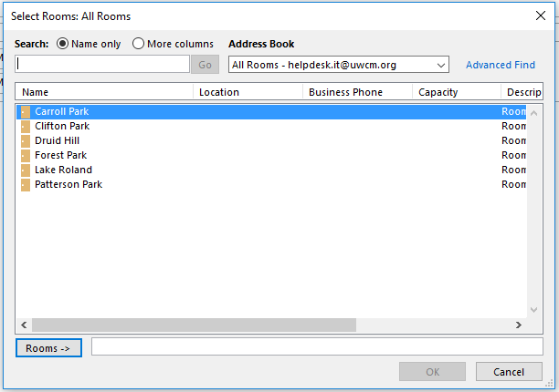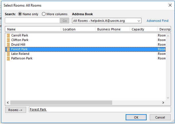 If you have selected more than one conference room to see what is available when originally scheduling the meeting, please remove the rooms you will NOT be using once you have finalized the conference room where the meeting is being held. This will avoid booking two rooms for the same meeting.